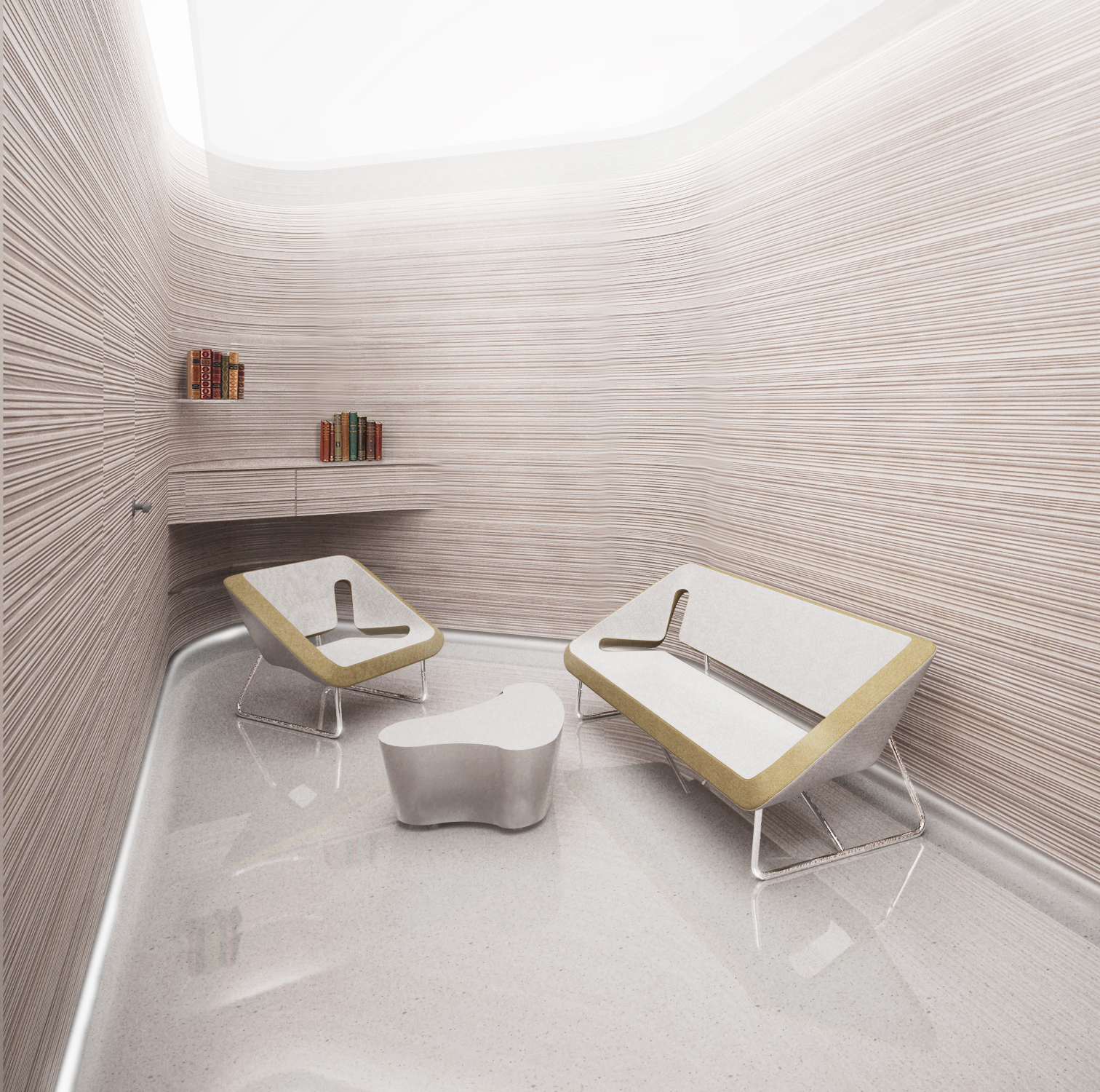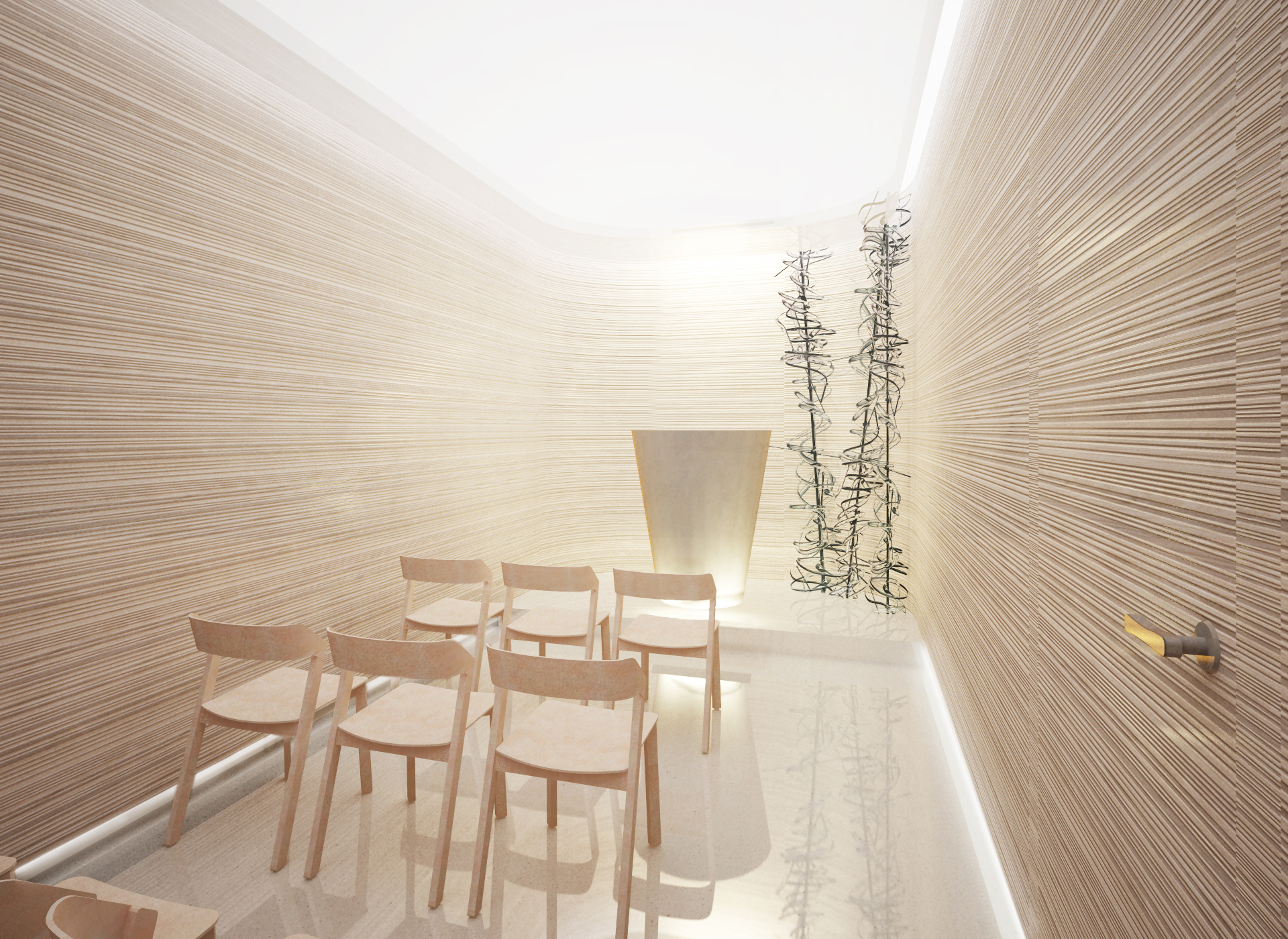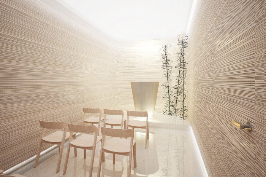 Návrh interiéru nové kaple je pojat ve smyslu univerzálního spirituálního prostoru, který poskytuje duševní klid pacientům nemocnice. Prostory jsou navrženy s důrazem na kvalitní materiál, světlé barevné tóny a hru se světlem. Hlavním motivem návrhu je dřevěný obklad s horizontálními drážkami, které se plynule vinou podél stěn.