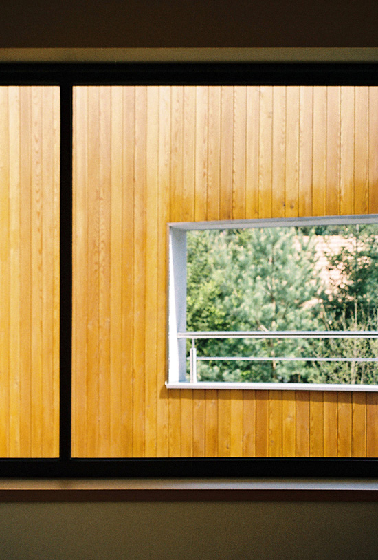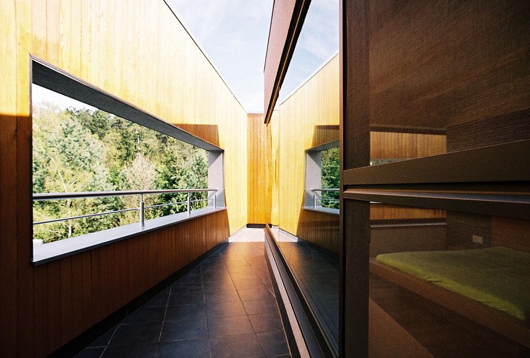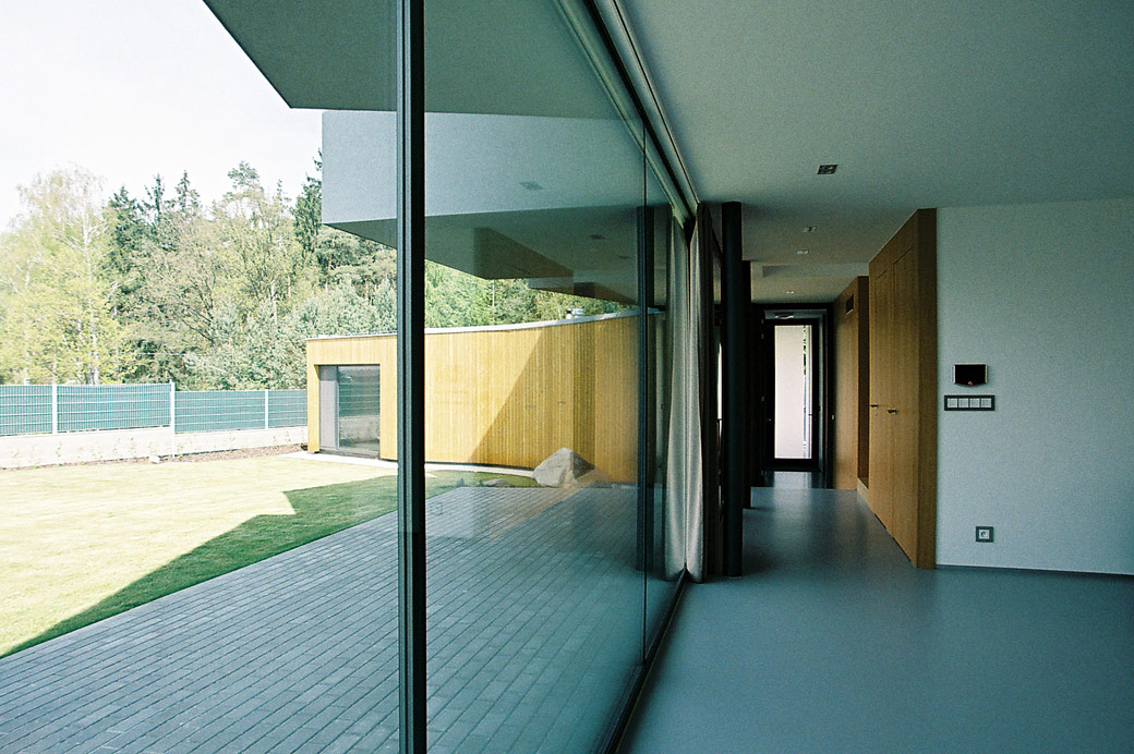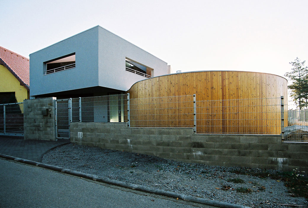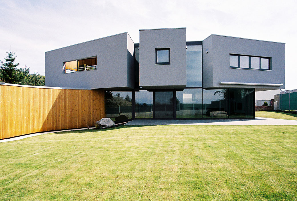 Je zde zrealizována dávná myšlenka vložení celoskleněné ložnice do prázdného boxu z možností zarostení pasivní zelení. Místnost je tak nečekaně v náruči přírody. Dům pro mladou rodinu ve vilkové vesnické čtvrti. Má jasně diferencované vně patrné funkce, směle se „rozhlíží” po krajině svýma třema očima. Dodatečně požadovaný objekt kůlny je materiálově odlišen dřevem a je vsunut pod hmoty druhého podlaží.