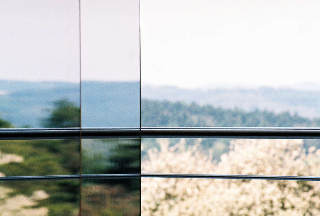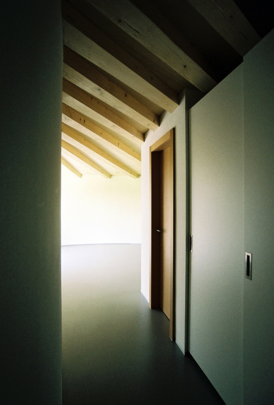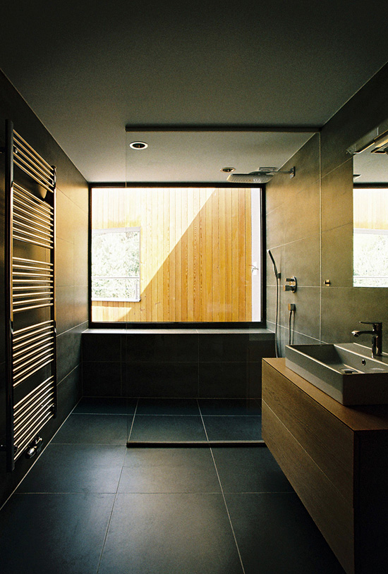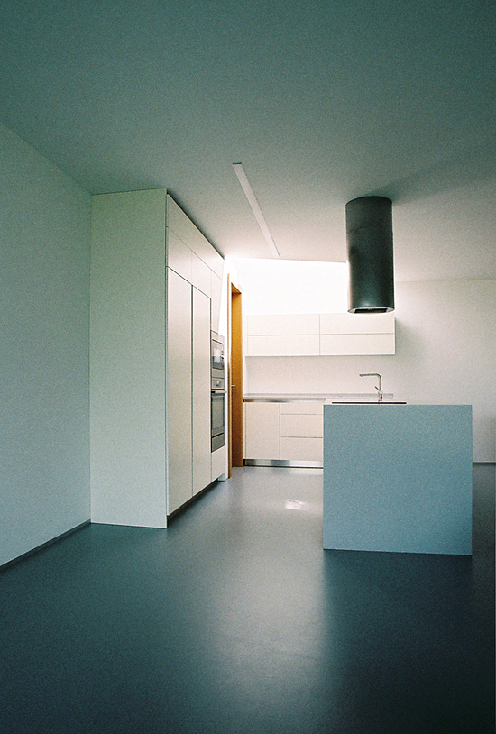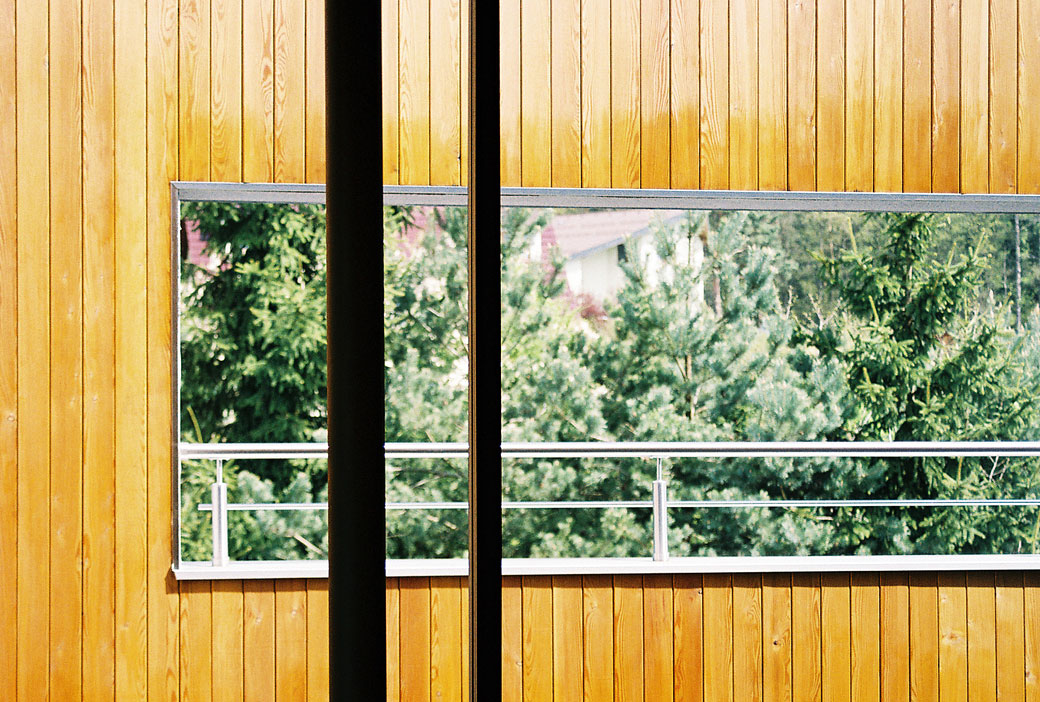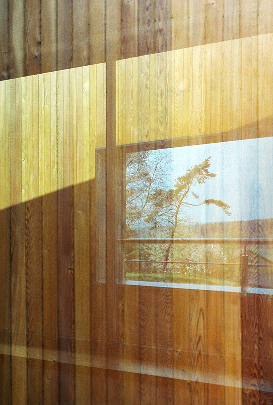 Je zde zrealizována dávná myšlenka vložení celoskleněné ložnice do prázdného boxu z možností zarostení pasivní zelení. Místnost je tak nečekaně v náruči přírody. Dům pro mladou rodinu ve vilkové vesnické čtvrti. Má jasně diferencované vně patrné funkce, směle se „rozhlíží” po krajině svýma třema očima. Dodatečně požadovaný objekt kůlny je materiálově odlišen dřevem a je vsunut pod hmoty druhého podlaží.