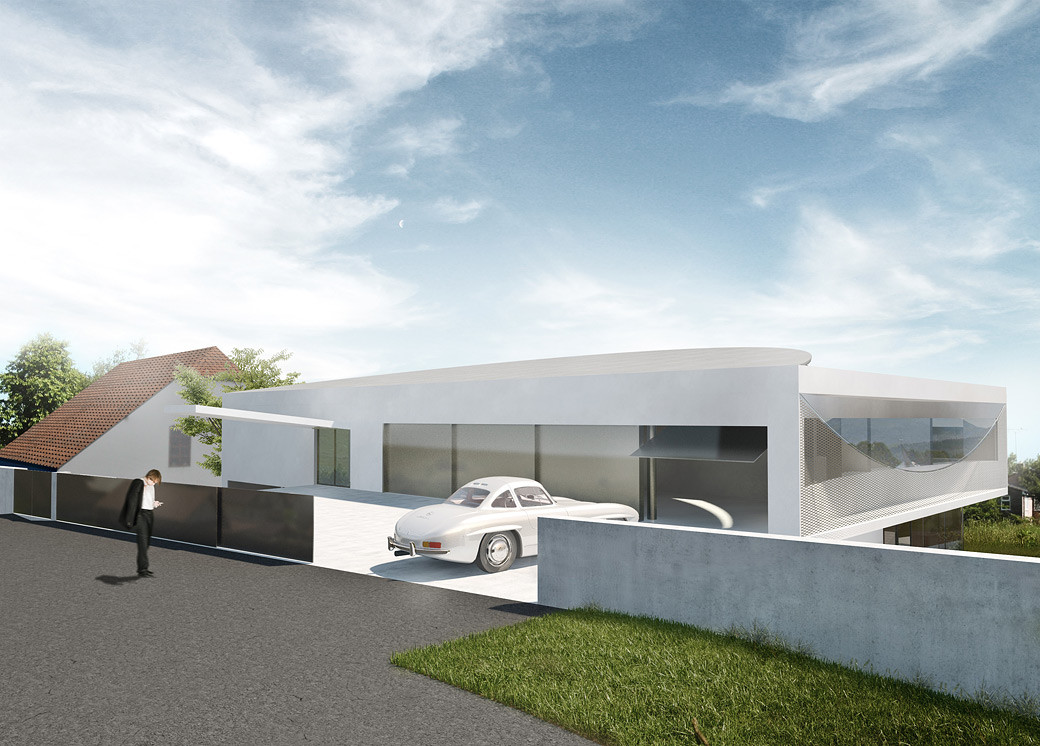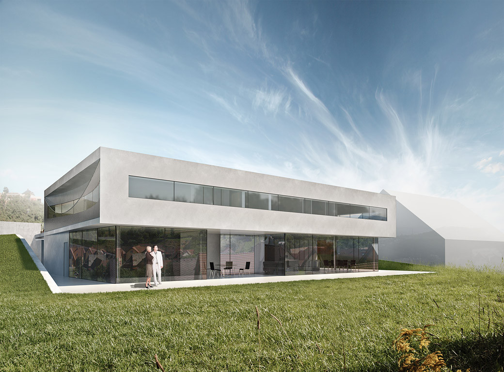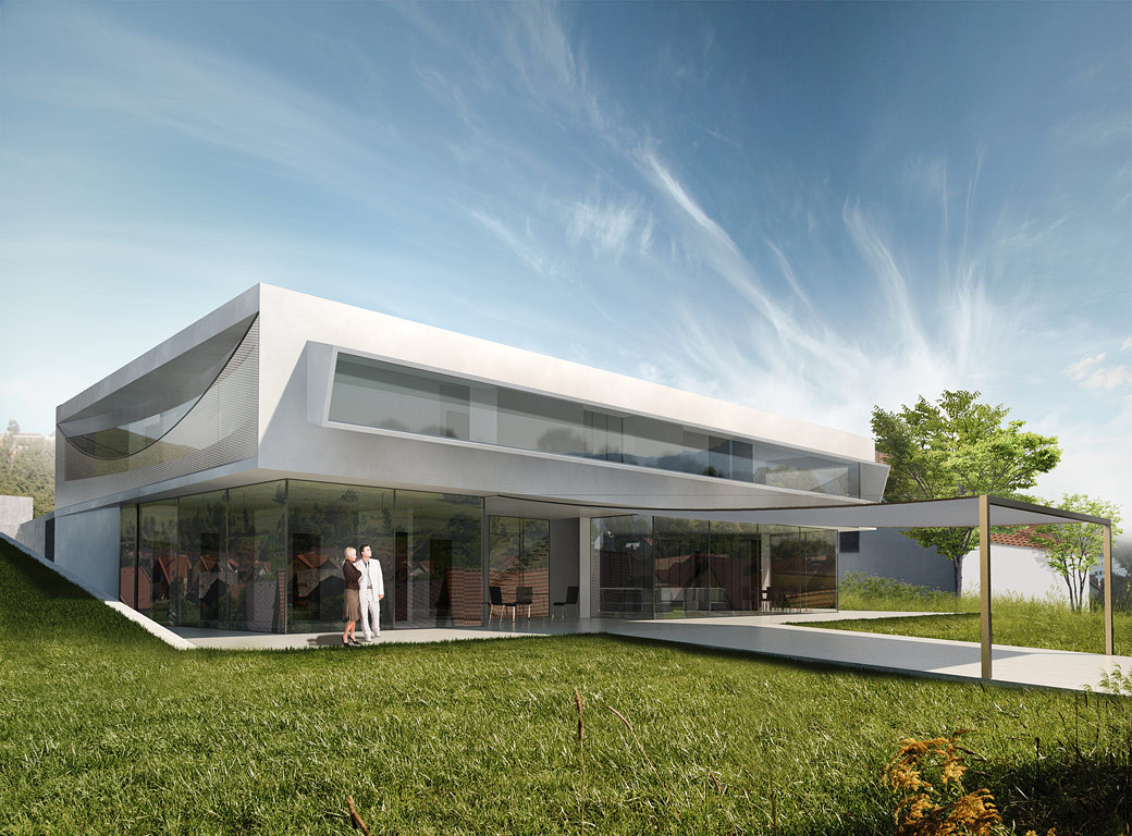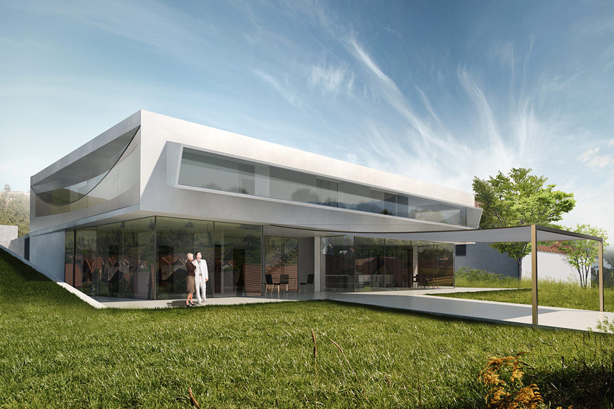 Elegantní příměstská vila pro racionálního spořádaného muže se závodnickým srdcem. Vila je kompaktní, zcela jednoduchá s důrazem na krásné výhledy, průhledy, zajímavé průniky slunce, dokonalé detaily, avšak bez zbytečné okázalosti. Okna jsou lemována masivním travertinem, zábradlí jsou vyplněna zavěšenými nerezovými sítěmi. Toto téma prověšování se v domě opakuje jako nenápadný leitmotiv.