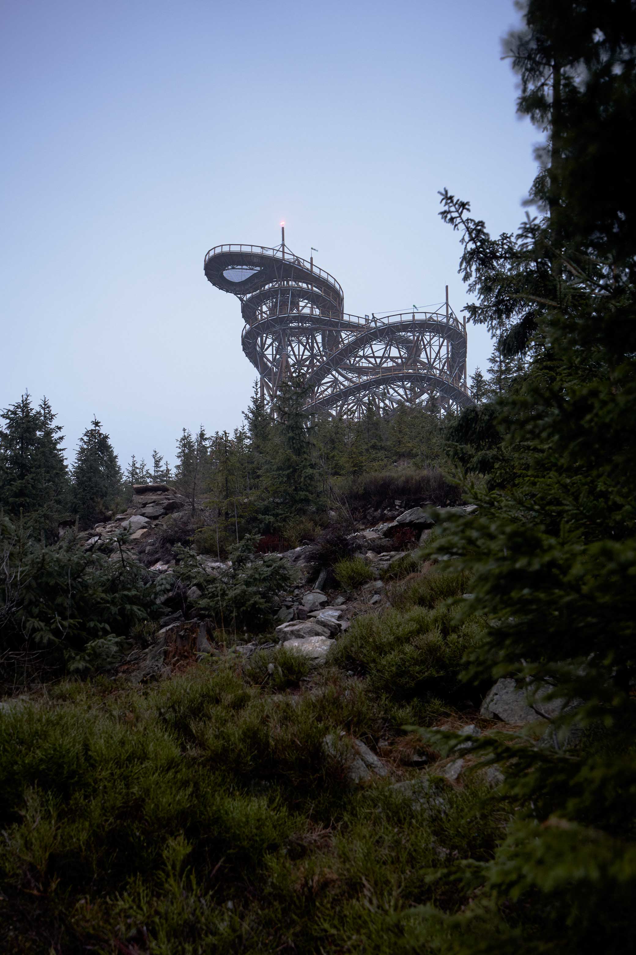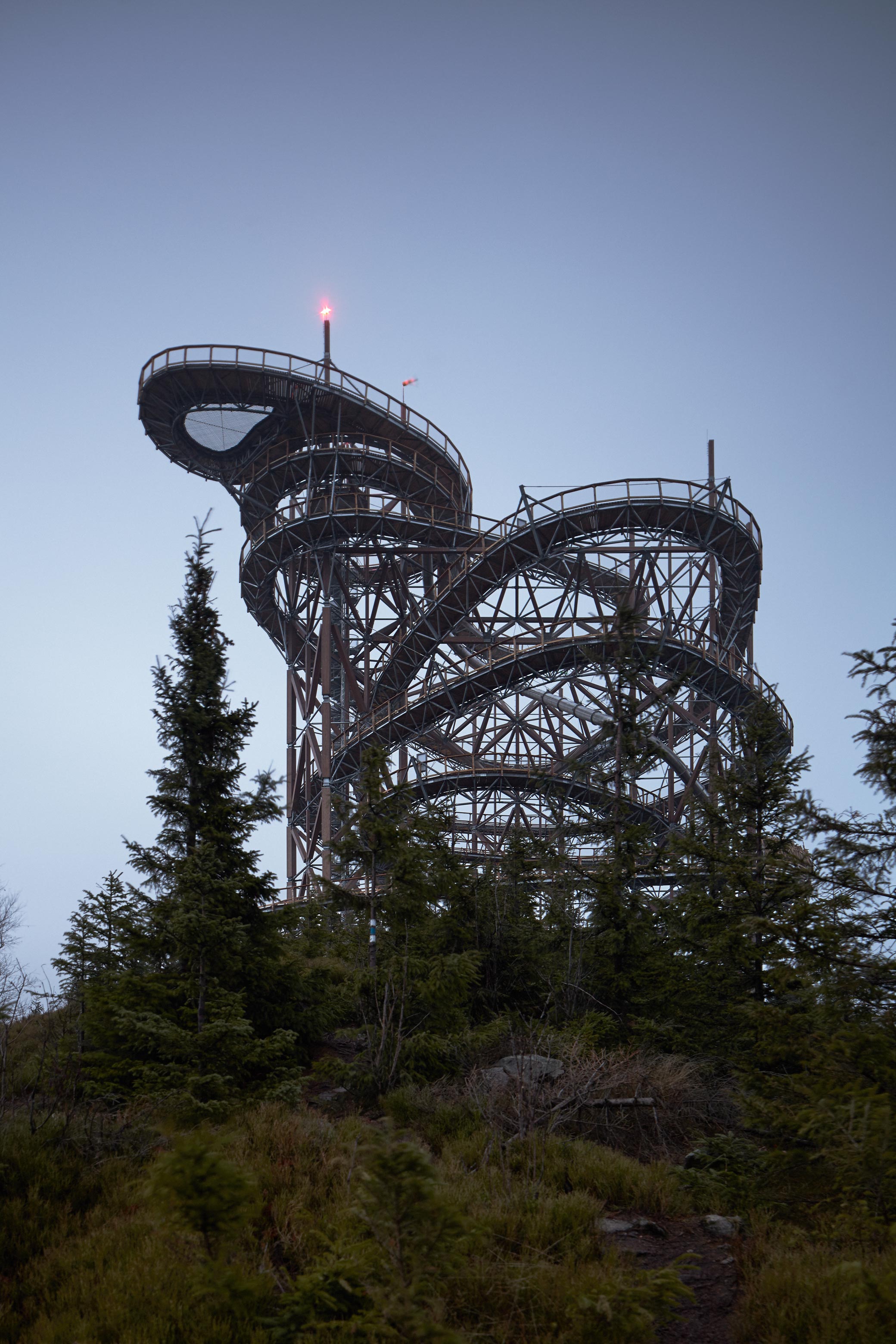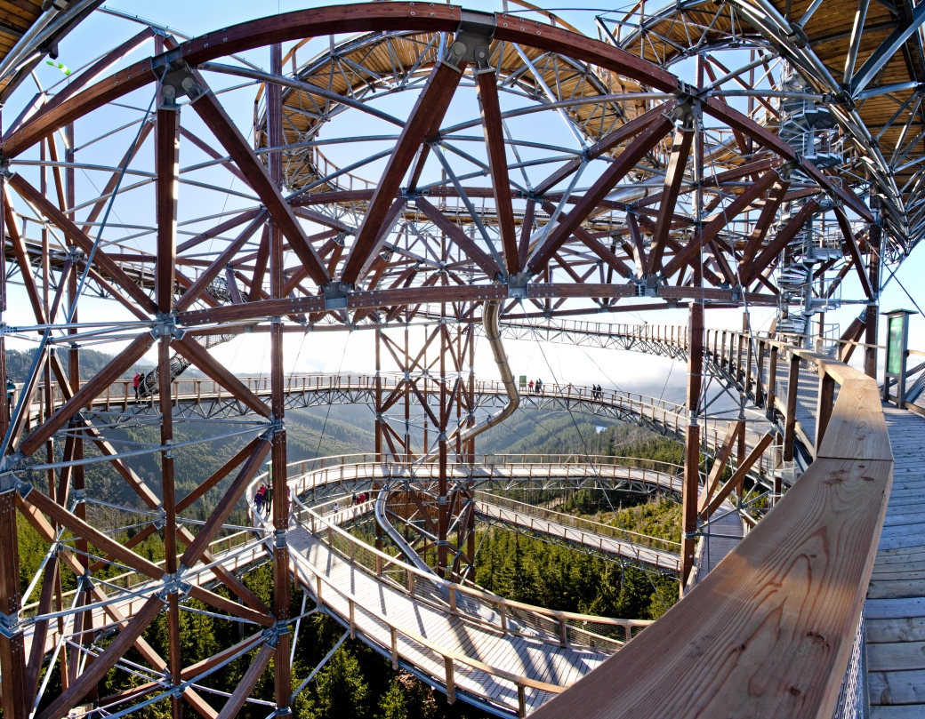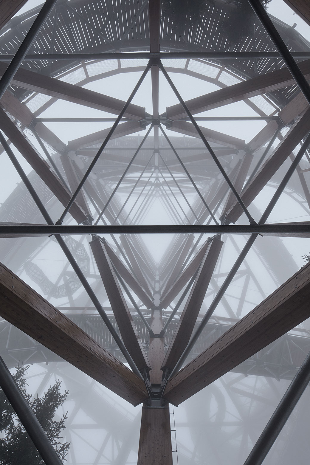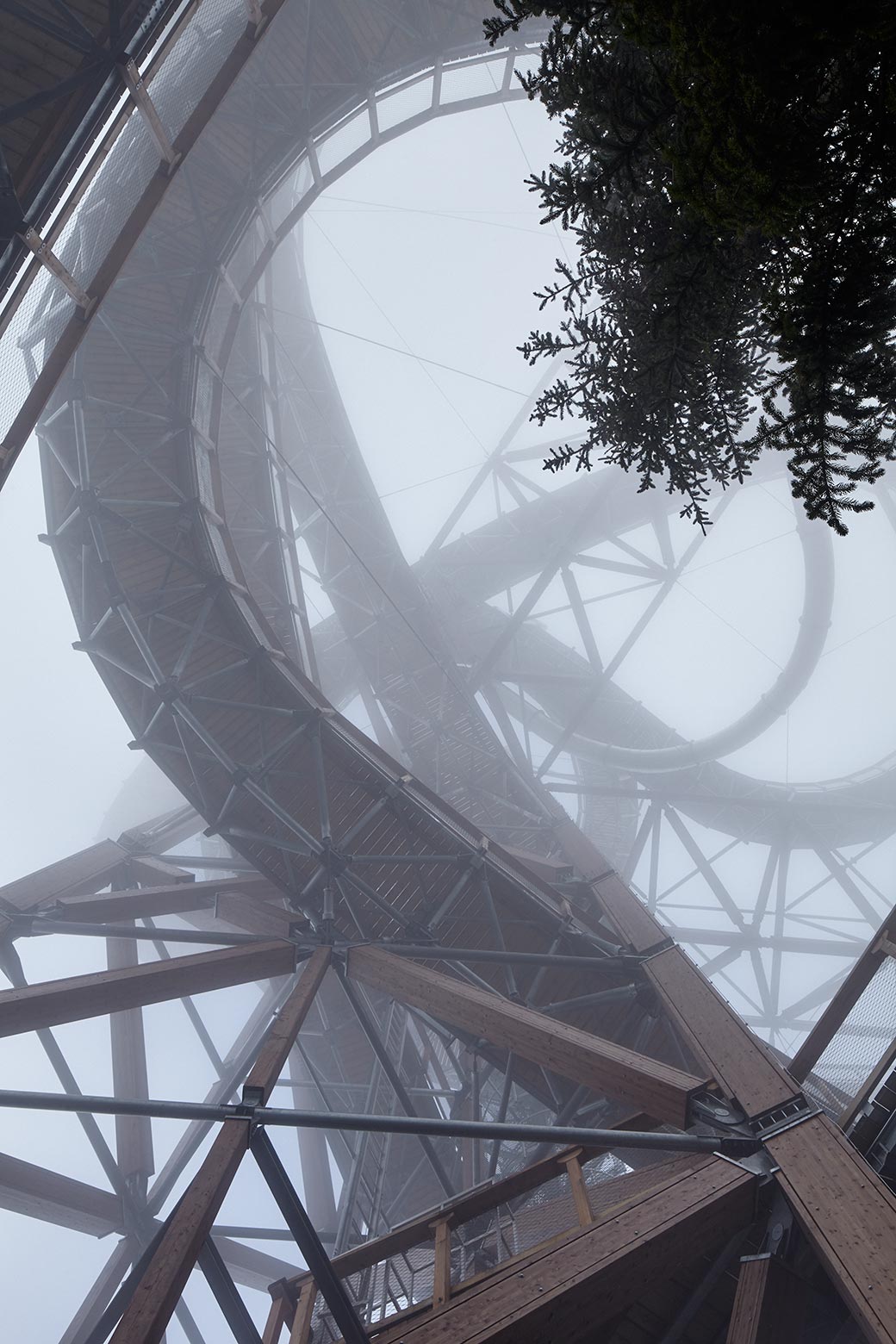 Objekt. "Stezka v oblacích" je ideovou stavbou, která má umožnit návštěvníkům zažít intenzivní pocit pobytu v mracích, zprostředkovat zážitek pobytu nad krajinou. Pro milovníky dobrodružství a zábavy je v objektu připraveno několik atrakcí, jako tobogán, sítě, hnízda, apod. Vstupní objekt má jemně elipsovitý tvar podobný lodičce. Nosná konstrukce vstupního objektu je rámová z lepeného dřeva. Architektonicky byla řešena tak, aby co nejméně narušovala unikátní prostředí v místě stavby. Proto byly v maximální míře použity materiály, jako jsou dřevo, co nejtransparentnější zábradlí a kotvící prvky v nejnutnější míře.
