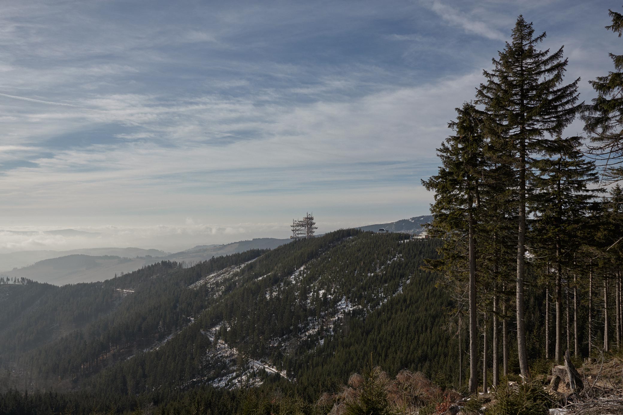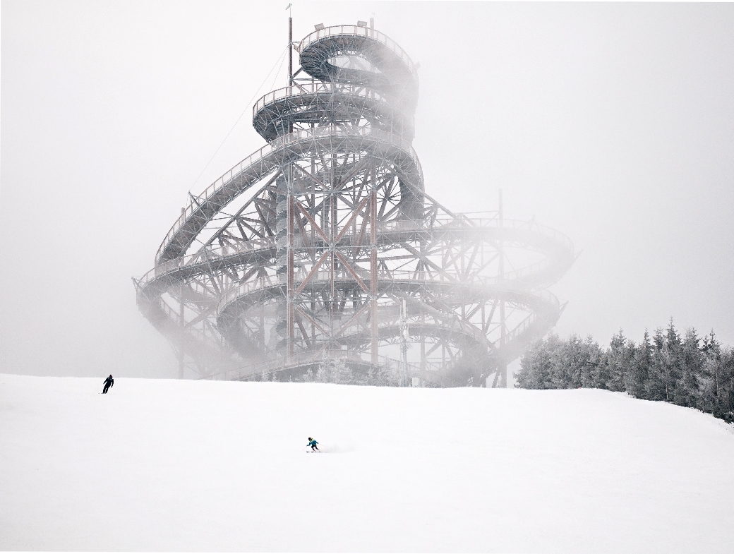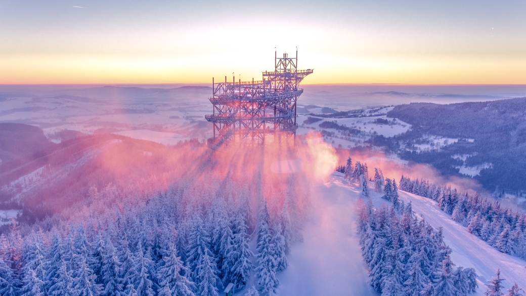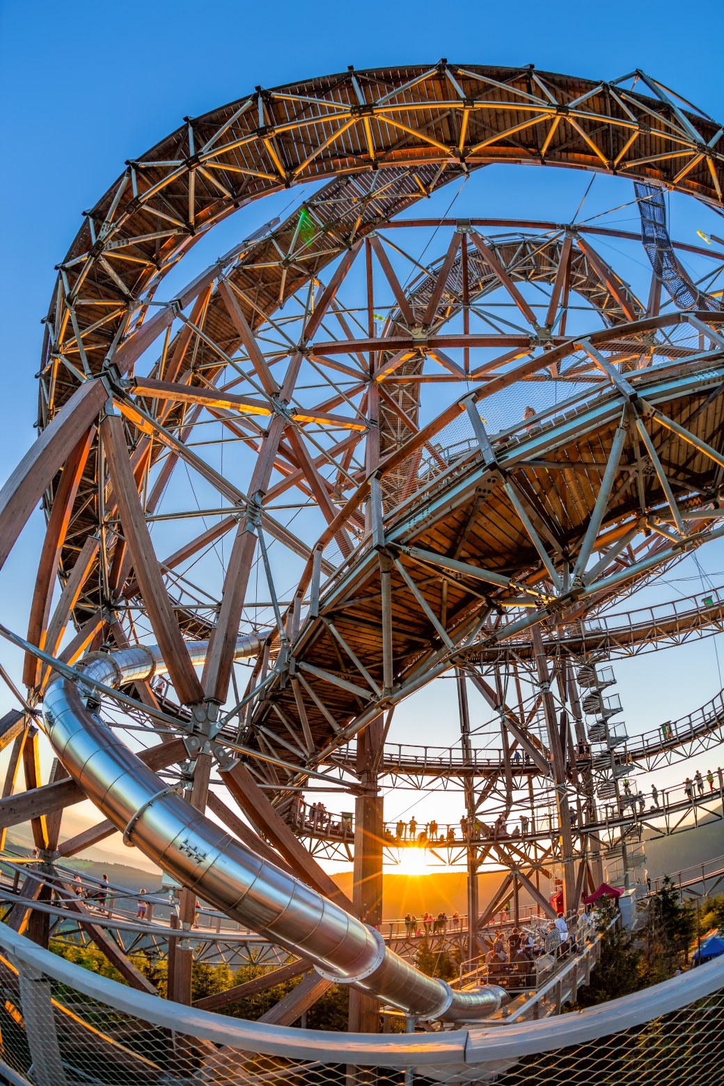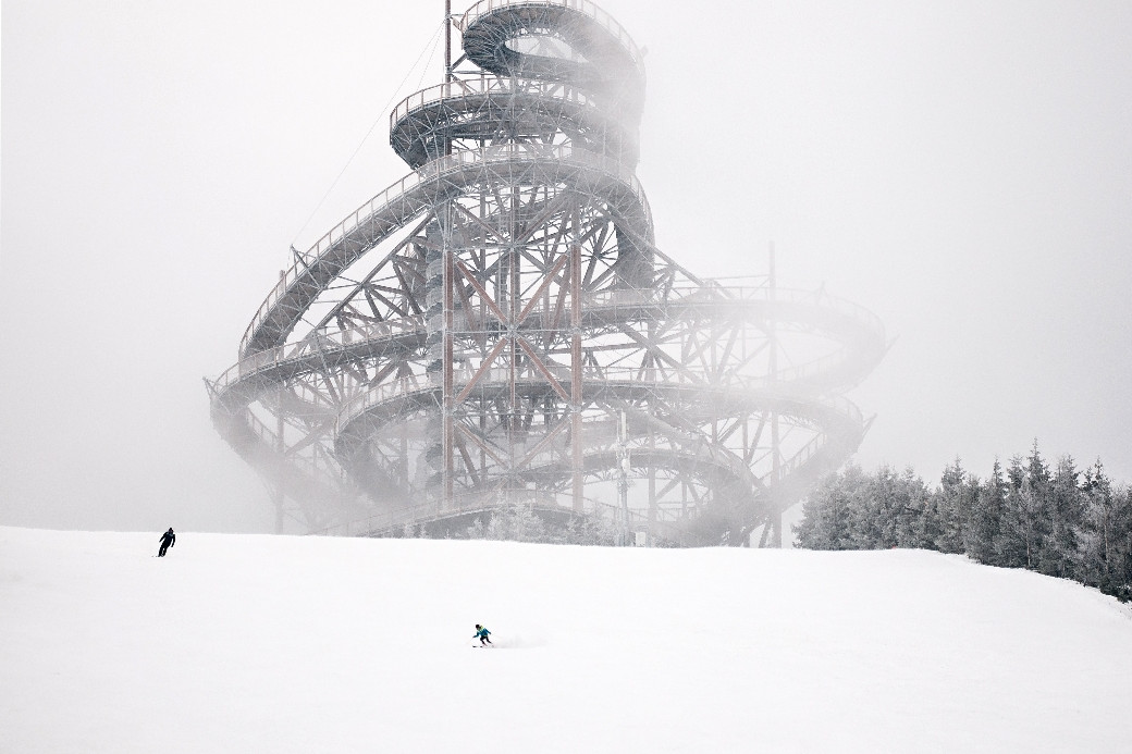 Objekt. "Stezka v oblacích" je ideovou stavbou, která má umožnit návštěvníkům zažít intenzivní pocit pobytu v mracích, zprostředkovat zážitek pobytu nad krajinou. Pro milovníky dobrodružství a zábavy je v objektu připraveno několik atrakcí, jako tobogán, sítě, hnízda, apod. Vstupní objekt má jemně elipsovitý tvar podobný lodičce. Nosná konstrukce vstupního objektu je rámová z lepeného dřeva. Architektonicky byla řešena tak, aby co nejméně narušovala unikátní prostředí v místě stavby. Proto byly v maximální míře použity materiály, jako jsou dřevo, co nejtransparentnější zábradlí a kotvící prvky v nejnutnější míře.