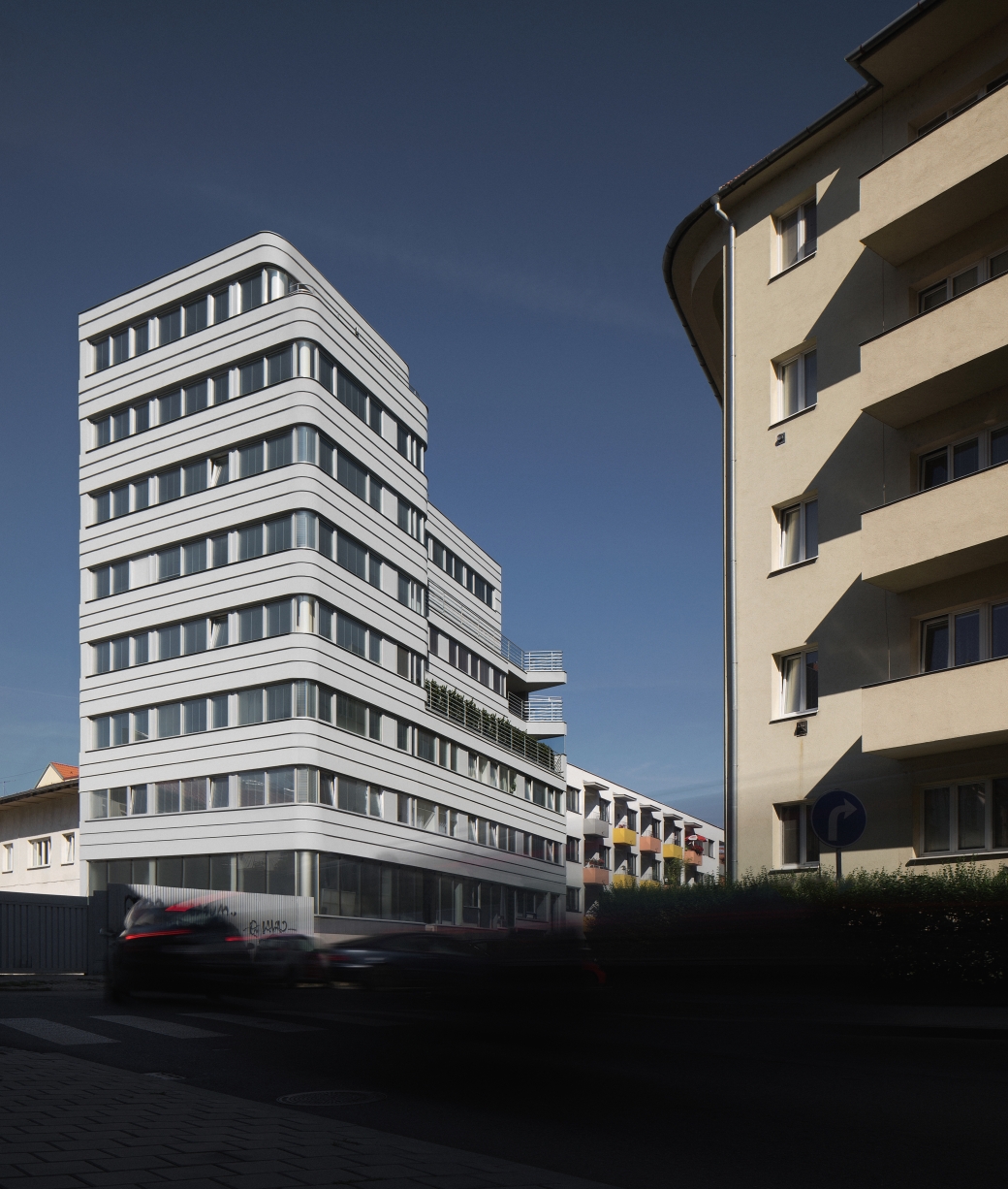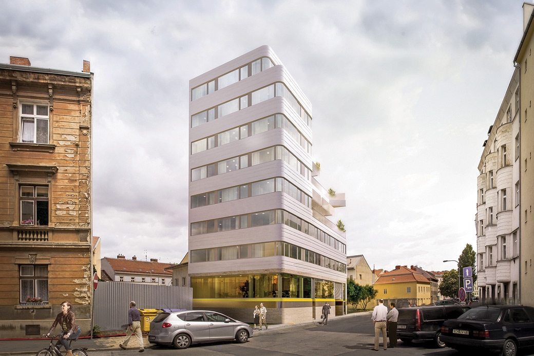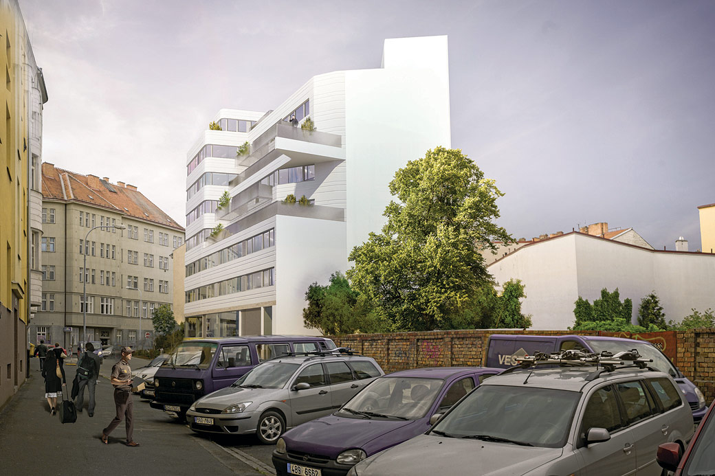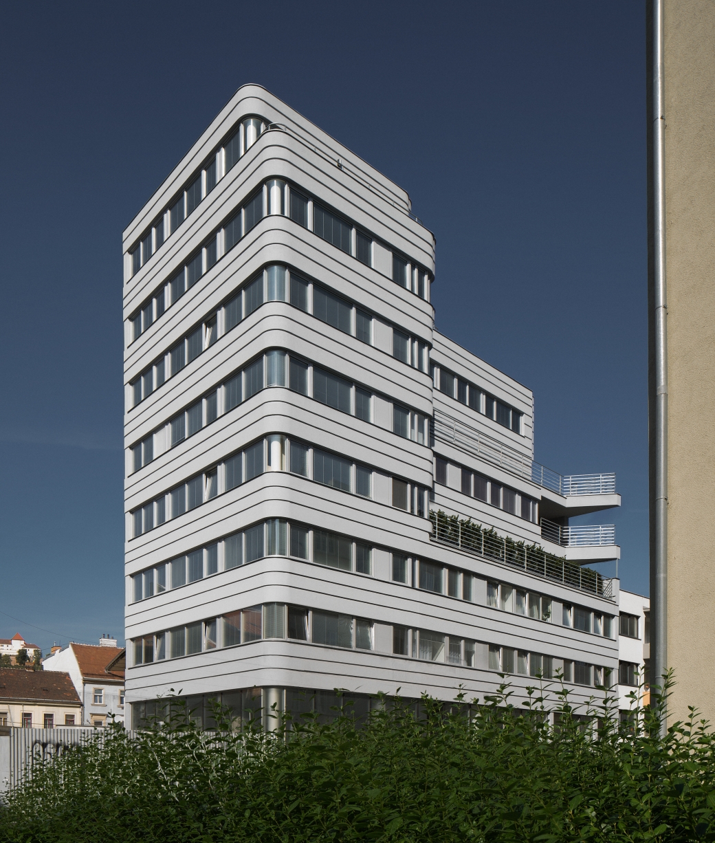 Je zde zrealizována dávná myšlenka vložení celoskleněné ložnice do prázdného boxu z možností zarostení pasivní zelení. Místnost je tak nečekaně v náruči přírody. Dům pro mladou rodinu ve vilkové vesnické čtvrti. Má jasně diferencované vně patrné funkce, směle se „rozhlíží” po krajině svýma třema očima. Dodatečně požadovaný objekt kůlny je materiálově odlišen dřevem a je vsunut pod hmoty druhého podlaží.
