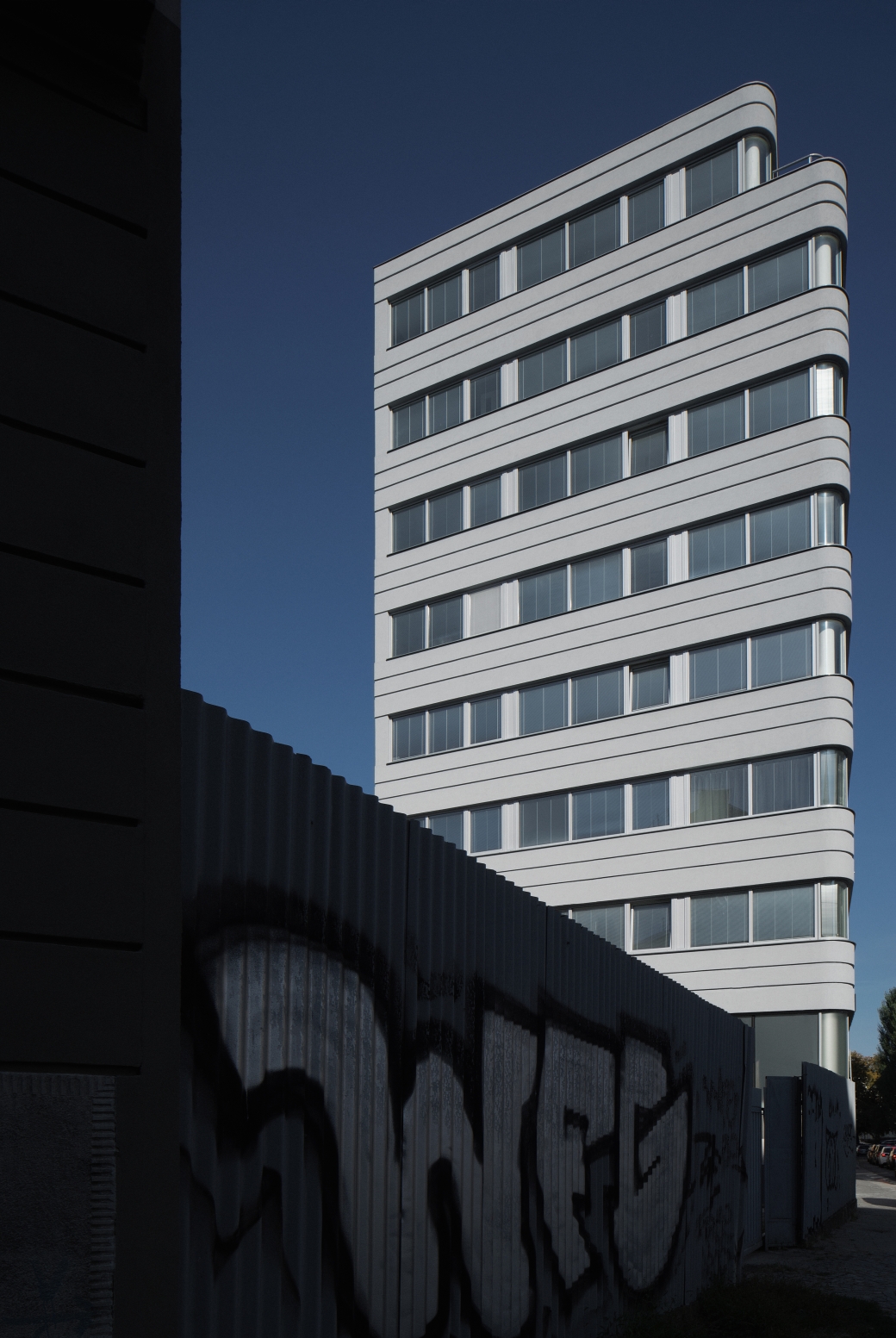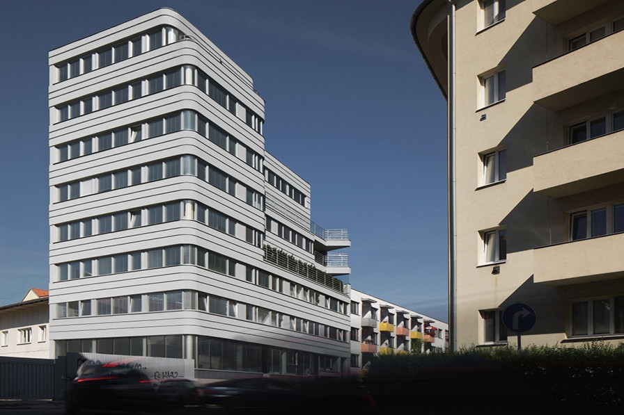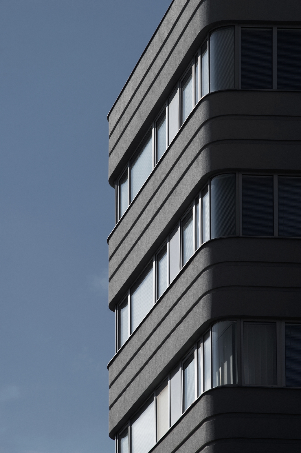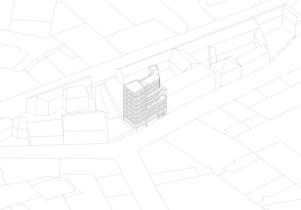 Je zde zrealizována dávná myšlenka vložení celoskleněné ložnice do prázdného boxu z možností zarostení pasivní zelení. Místnost je tak nečekaně v náruči přírody. Dům pro mladou rodinu ve vilkové vesnické čtvrti. Má jasně diferencované vně patrné funkce, směle se „rozhlíží” po krajině svýma třema očima. Dodatečně požadovaný objekt kůlny je materiálově odlišen dřevem a je vsunut pod hmoty druhého podlaží.